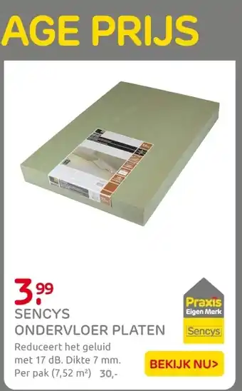 De prijs van de Sencys ondervloer platen kan ook teruggevonden worden hierboven op de pagina, samen met de datum van wanneer de aanbieding beschikbaar is. Ook kun je de prijzen in de huidige Praxis folder of op de Praxis website controleren. De aanbiedingen verzekeren je van het kopen van de Praxis producten voor de laagste prijs.