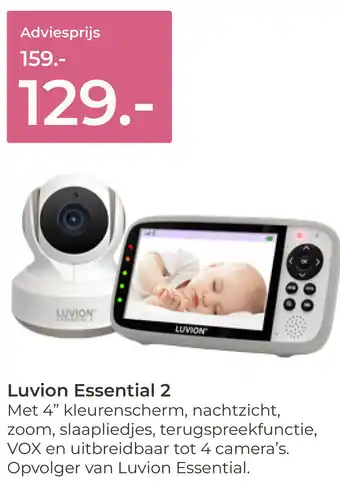 Prenatal biedt naast de Luvion Essential 2 een ruime collectie producten aan. Houd de wekelijkse Prenatal folder in de gaten om de beste aanbiedingen en acties te vinden. Naast Luvion Essential 2, kunt u ook de volgende aanbiedingen vinden: Luvion Essential 2 uitbreidingscamera, Babyfoon Luvion Essential 2 White & Luvion Essential Connect Crib.
