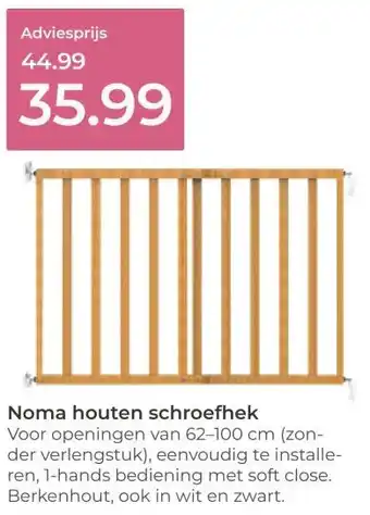 De Noma houten schroefhek is momenteel met korting verkrijgbaar bij Prenatal. Hier vind je alle details over prijs, geldigheidsduur en actievoorwaarden. Vergeet niet om ook andere aanbiedingen en deals voor Noma houten schroefhek te bekijken zodat je zeker weet dat je de beste prijs betaalt. De kortingsactie loopt van 27-04-2026 tot 03-05-2026. Is de actie inmiddels verlopen? Geen zorgen, vergelijk dan soortgelijke aanbiedingen of volg de productcategorie voor toekomstige prijsverlagingen. Zo koop je altijd met voordeel.Veelgestelde vragen over Noma houten schroefhek