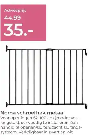 De prijs van de Noma schroefhek metaal kan ook teruggevonden worden hierboven op de pagina, samen met de datum van wanneer de aanbieding beschikbaar is. Ook kun je de prijzen in de huidige Prenatal folder of op de Prenatal website controleren. De aanbiedingen verzekeren je van het kopen van de Prenatal producten voor de laagste prijs.
