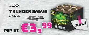 Quartel Vuurwerk biedt naast de I504 thunder salvo een ruime collectie producten aan. Houd de wekelijkse Quartel Vuurwerk folder in de gaten om de beste aanbiedingen en acties te vinden. Naast I504 thunder salvo, kunt u ook de volgende aanbiedingen vinden: I504 thunder salvo, I504 Thunder Salvo & Thunder salvo.