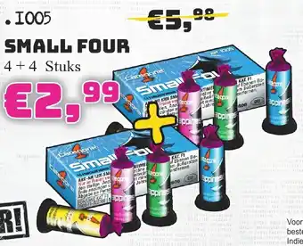 De prijs van de Small four kan ook teruggevonden worden hierboven op de pagina, samen met de datum van wanneer de aanbieding beschikbaar is. Ook kun je de prijzen in de huidige Quartel Vuurwerk folder of op de Quartel Vuurwerk website controleren. De aanbiedingen verzekeren je van het kopen van de Quartel Vuurwerk producten voor de laagste prijs.