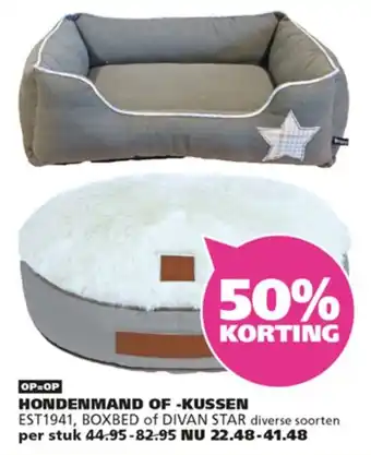 Op zoek naar een comfortabele slaapplek voor jouw trouwe viervoeter? Profiteer nu van maar liefst 50% KORTING op diverse soorten hondenmanden en -kussens. Kies uit een EST1941 boxbed of divan STAR in verschillende maten en kleuren, nu verkrijgbaar voor slechts 22.48-41.48 per stuk. Wees er snel bij, want OP=OP! Of je nu een kleine chihuahua of een grote labrador hebt, er is voor ieder wat wils. Geef jouw hond het comfort dat hij verdient met een kwalitatieve hondenmand of -kussen. Sinds 1941 zijn wij gespecialiseerd in dierenbenodigdheden en weten we precies wat jouw harige vriend nodig heeft. Bestel nu en laat jouw hond genieten van zijn eigen plekje!