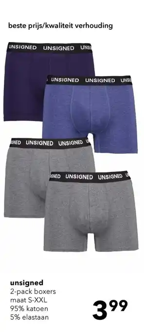 De aanbieding is verkrijgbaar in verschillende winkels, bekijk alle producten om de goedkoopste unsigned 2 pack boxers te krijgen. Als je graag wilt kijken of het artikel met meer korting te koop is in een andere winkel, bekijk de categorie 'Kleding en Schoenen'. Wellicht vind je deze aanbiedingen ook interessant: Unsigned 2 pack boxers, puma 2 pack boxers & Unsigned singlet.