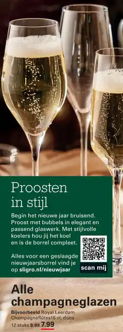 Begin het nieuwe jaar bruisend met alle champagneglazen die je nodig hebt voor een geslaagde nieuwjaarsborrel. Op sligro.nl/nieuwjaar vind je alles wat je nodig hebt, zoals de Royal Leerdam Champagneflûtes 15 cl. Deze stijlvolle glazen zijn perfect voor het proosten in stijl. Met de koelers hou je de bubbels koel en maak je de borrel compleet. Of je nu een doos van 12 stuks wilt of een ander aantal, alle champagneglazen zijn beschikbaar. Scan de producten eenvoudig met de Sligro app en bestel ze direct online. Zo ben je helemaal klaar voor een feestelijke start van het nieuwe jaar. Proost!
