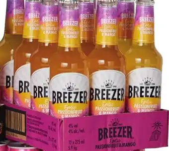 Geniet van de verfrissende smaak van de Passion Breezer, een heerlijke mix van passievrucht en mango. Met een alcoholpercentage van 4% vol is deze Breezer perfect voor een zomerse dag of een gezellige avond met vrienden. De exotische smaak van passievrucht en mango zorgt voor een tropische twist en maakt deze Breezer een echte aanrader voor liefhebbers van fruitige drankjes. Of je nu op zoek bent naar een verfrissend drankje voor op het strand of een smaakvolle toevoeging aan je feestje, de Passion Breezer is altijd een goede keuze. Probeer hem nu en laat je verrassen door de heerlijke combinatie van passievrucht en mango!