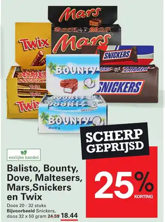 Balisto, Bounty, Dove, Maltesers, Mars,Snickers en Twix aanbieding en online acties bij Sligro