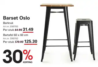 De Barset Oslo Barkruk is een stijlvolle toevoeging aan je interieur. De barkruk heeft een modern design en is perfect voor aan een bartafel. De barkruk is verkrijgbaar onder art.nr. 099785 en kost normaal gesproken 44.99 per stuk. Maar nu profiteer je van een korting van 30%, waardoor de prijs slechts 31.49 per stuk is. Combineer de barkruk met de bijpassende bartafel van 60 x 60 cm (art.nr. 099783) voor een complete set. De Barset Oslo Barkruk is van hoge kwaliteit en zorgt voor comfort tijdens het zitten. Haal deze trendy barkrukken nu in huis en geniet van een gezellige en sfeervolle eet- of drinkhoek.
