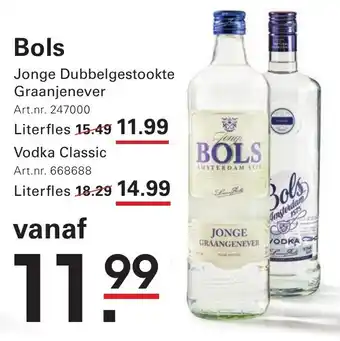 De prijs van de Bols Jonge Dubbelgestookte Graanjenever kan ook teruggevonden worden hierboven op de pagina, samen met de datum van wanneer de aanbieding beschikbaar is. Ook kun je de prijzen in de huidige Sligro folder of op de Sligro website controleren. De aanbiedingen verzekeren je van het kopen van de Sligro producten voor de laagste prijs.