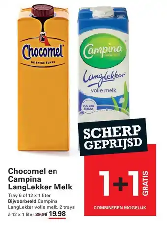 Chocomel en Campina LangLekker Melk 12 x 1 liter 1+1 GRATIS