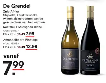 Ontdek de karakteristieke wijnen van De Grendel uit Zuid-Afrika, als eerbetoon aan de rijke geschiedenis van het wijnhuis. Proef de Koetshuis Sauvignon Blanc Art.nr. 918177 met zijn verfrissende smaken, of geniet van de Amandelboord Pinotage Art.nr. 164153 met zijn unieke aroma's. Vanaf slechts €7.99 kunt u deze prachtige wijnen ervaren en de smaak van Zuid-Afrika ontdekken. Met labels als DEGRENDEL, CAFE OF GOOD HOPE KOETSHUIS SAUVIGNON BLANC en AMANDELBOORD PINOTAGE, bent u verzekerd van kwaliteit en authenticiteit. Laat u meevoeren naar de prachtige wijngaarden van Cape of Good Hope en geniet van een unieke wijnervaring met De Grendel.