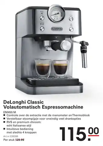 Met de DeLonghi Classic Volautomatische Espressomachine EM450.M geniet je van heerlijke koffie met slechts 4 knoppen. Dit apparaat biedt controle over de extractie met de manometer en Thermoblock technologie. Het verstelbare stoompijpje zorgt voor oneindig veel drankopties, zoals Espresso, 2x Espresso, HOT MILK en CAPPUCCINO. De machine is uitgevoerd in RVS en premium chroom, wat zorgt voor een echte Italiaanse stijl. Art.nr 226286, nu verkrijgbaar voor slechts €115.00 per stuk. Met de intuïtieve bediening en hoogwaardige materialen is dit de perfecte espressomachine voor thuisgebruik. Geniet van authentieke Italiaanse koffie met de DeLonghi Classic Volautomatische Espressomachine.