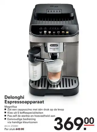 Met het DeLonghi Magnifica Espressoapparaat zet je eenvoudig een heerlijke cappuccino met slechts één druk op de knop. Kies uit 5 verschillende koffiespecialiteiten en pas zelf de sterkte en hoeveelheid aan naar jouw voorkeur. De bediening is zeer eenvoudig dankzij de handige kleuriconen op het apparaat. Het Art.nr. 212251 is verkrijgbaar voor slechts 369.00. Geniet van de perfecte kop koffie in de ochtend of als oppepper gedurende de dag. Met de DeLonghi Magnifica haal je een stukje Italiaanse kwaliteit in huis en kun je elke dag genieten van jouw favoriete koffievariaties. Bestel nu en ervaar het gemak en de heerlijke smaak van verse espresso!