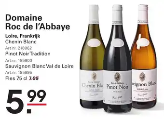 Ontdek de heerlijke wijnen van Domaine Roc de l'Abbaye uit de Loire, Frankrijk. Kies uit Chenin Blanc, Pinot Noir Tradition of Sauvignon Blanc Val de Loire. De Chenin Blanc heeft een art.nr. 218062 en kost slechts 7.99 per fles van 75 cl. De Pinot Noir Tradition heeft een art.nr. 185900 en kost 5.99 per fles. De Sauvignon Blanc Val de Loire heeft een art.nr. 185895. Geniet van de unieke smaken van deze prachtige wijnen, perfect voor elke gelegenheid. Bestel nu en laat je verrassen door de kwaliteit en het vakmanschap van Domaine Roc de l'Abbaye.