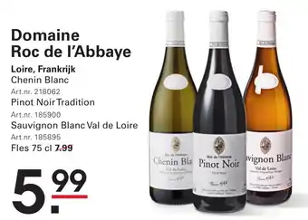 Geniet van de heerlijke wijnen van Domaine Roc de l'Abbaye uit de Loire, Frankrijk. Kies uit de Chenin Blanc, Pinot Noir Tradition of Sauvignon Blanc Val de Loire. De Chenin Blanc heeft een artikelnummer van 218062 en kost slechts 7.99 per fles van 75 cl. De Pinot Noir Tradition heeft een artikelnummer van 185900 en kost 5.99 per fles. De Sauvignon Blanc Val de Loire heeft een artikelnummer van 185895. Proef de unieke smaken van deze prachtige Franse wijnen, gemaakt met passie en vakmanschap. Perfect voor bij een feestelijke gelegenheid of gewoon om van te genieten in goed gezelschap. Bestel nu en haal een stukje Frankrijk in huis!