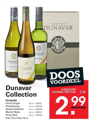Ontdek de heerlijke Dunavar Collection uit Hongarije met een mix van Pinot Grigio, Chardonnay en Grüner Veltliner. Deze verfijnde witte wijn is perfect voor liefhebbers van frisse en fruitige smaken. Geniet van de subtiele tonen van citrusvruchten en bloemen in elke slok. De Dunavar Collection bevat ook Merlot Rosé en Pinot Noir voor de liefhebbers van rosé en rode wijn. Bestel nu een doos met 6 dezelfde flessen voor extra voordeel. Elke fles van 75 cl heeft een uniek art.nr. en is verkrijgbaar voor slechts €3.59 per fles. Haal deze prachtige Hongaarse wijnen in huis en geniet van een smaakvolle ervaring!