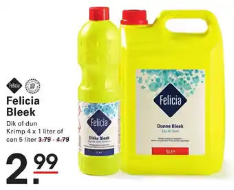 Felicia Bleek is een krachtig bleekmiddel verkrijgbaar in een can van 5 liter. Deze dikke bleek, ook bekend als Eau de Javel Epaisse, is ideaal voor het reinigen en desinfecteren van oppervlakken in huis. Met een keuze tussen dik of dun, kunt u de Felicia Bleek aanpassen aan uw specifieke behoeften. De krimp 4 x 1 liter verpakking is handig voor gebruik in verschillende ruimtes. Of u nu hardnekkige vlekken wilt verwijderen of gewoon een grondige reiniging wilt uitvoeren, Felicia Bleek staat voor u klaar. Bestel nu uw can van 5 liter voor slechts 3.79 - 4.79 en houd uw huis schoon en fris met Felicia.