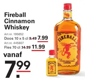 Art.nr. 195652 - Proef de unieke smaak van Fireball Cinnamon Whiskey, een heerlijke KANEEL & WHISKY LIKEUR. Deze kruidige likeur combineert de pittige smaak van kaneel met de warmte van whisky, resulterend in een verrassend lekkere drank. Perfect om puur van te genieten, in cocktails te verwerken of als shot te drinken. Met een alcoholpercentage van 31% zorgt Fireball Cinnamon Whiskey voor een intense smaakbeleving. Bestel nu jouw fles vanaf slechts €7.99 en ontdek zelf waarom deze likeur wereldwijd geliefd is. Ideaal voor feestjes, als cadeau of gewoon voor een gezellige avond thuis. Haal de Fireball Cinnamon Whiskey in huis en geniet van een drankje vol vuur en passie.
