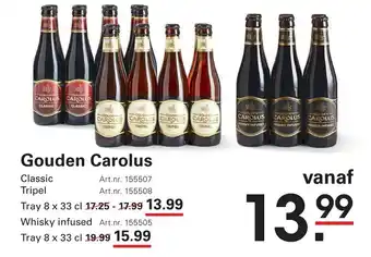 De prijs van de Gouden Carolus kan ook teruggevonden worden hierboven op de pagina, samen met de datum van wanneer de aanbieding beschikbaar is. Ook kun je de prijzen in de huidige Sligro folder of op de Sligro website controleren. De aanbiedingen verzekeren je van het kopen van de Sligro producten voor de laagste prijs.