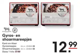 Geniet van heerlijke Gyros- en shoarmareepjes van Kaldenberg, gemaakt van hoogwaardig kwaliteitsvlees. Deze kant-en-klare Gyrosreepjes en Shoarmareepjes zijn eenvoudig te bereiden en perfect voor een snelle en smaakvolle maaltijd. De Gyrosreepjes hebben artikelnummer 204844 en de Shoarmareepjes artikelnummer 204843. Beide varianten worden verkocht in een doos van 1 kilo voor slechts 17,50 euro. Met deze voordelige prijs van 12,99 euro per kilo haal je topkwaliteit vlees in huis voor een betaalbare prijs. Probeer de Gyros- en shoarmareepjes van Kaldenberg vandaag nog en ontdek de heerlijke smaak en kwaliteit van deze populaire vleesproducten.