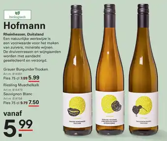 Een natuurlijke werkwijze is een voorwaarde voor het maken van zuivere, minerale wijnen. Hofmann selecteert en verzorgt de druivenrassen en wijngaarden met aandacht. Proef de Grauer Burgunder Trocken, Riesling Muschelkalk en Sauvignon Blanc van Hofmann. Deze biologische wijnen zijn verkrijgbaar vanaf 5.99. Geniet van de kwaliteit en smaak van Hofmann, een gerenommeerd wijnhuis uit Rheinhessen, Duitsland. Bestel nu de Grauer Burgunder Trocken (Art.nr. 814551), Riesling Muschelkalk (Art.nr. 814470) en Sauvignon Blanc (Art.nr. 814158) en ontdek de unieke smaken van deze prachtige wijnen. Hofmann staat garant voor topkwaliteit en duurzaamheid in elke fles.