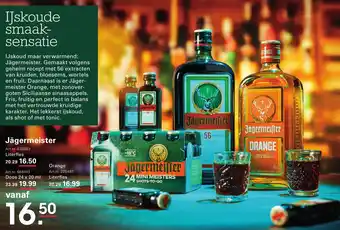 Jägermeister, gemaakt volgens geheim recept met 56 extracten van kruiden, bloesems, wortels en fruit, biedt een ijskoude smaak-sensatie. Daarnaast is er Jägermeister Orange, met zonovergoten Siciliaanse sinaasappels. Fris, fruitig en perfect in balans met het vertrouwde kruidige karakter. Het lekkerst ijskoud, als shot of met tonic. Art.nr. 433863, Literfles, 20.29 16.50. Art.nr. 668413, Doos 24 x 20 ml, 23.39 19.99 vanaf. Orange, Art.nr. 225487 Literfles 20.29 16.99. Jägermeister, SERVICE COLD, TO BE PRECISE, 24 MINI MEISTERS, SHOTS-TO-GO, Jägermeister, ED, 56, BOTANICALS, SINCE 1837, NATURE, Jägermeister ORANGE, MADE WITH SICILIAN ORANGES, DER KRAUTERLIKOR.