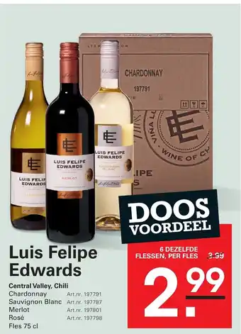 De prijs van de Luis Felipe Edwards kan ook teruggevonden worden hierboven op de pagina, samen met de datum van wanneer de aanbieding beschikbaar is. Ook kun je de prijzen in de huidige Sligro folder of op de Sligro website controleren. De aanbiedingen verzekeren je van het kopen van de Sligro producten voor de laagste prijs.