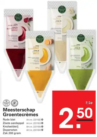 Ontdek de heerlijke Meesterschap Groentecrèmes, verkrijgbaar in verschillende smaken zoals Rode biet, Zoete aardappel, Knolselderij en Doperwten. De crèmes zijn perfect om je gerechten mee te verrijken en een unieke twist te geven. De Rode biet crème heeft een rijke smaak en mooie kleur, terwijl de Zoete aardappel crème een zoete en romige textuur heeft. De Knolselderij crème is lekker hartig en de Doperwten crème is heerlijk fris. Met Meesterschap Groentecrèmes breng je jouw kookkunsten naar een hoger niveau en verras je je gasten keer op keer. Bestel nu en geniet van deze culinaire hoogstandjes! Verkrijgbaar in handige zakjes van 200 gram voor slechts €2,99 per stuk.