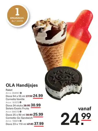 De prijs van de OLA Handijsjes kan ook teruggevonden worden hierboven op de pagina, samen met de datum van wanneer de aanbieding beschikbaar is. Ook kun je de prijzen in de huidige Sligro folder of op de Sligro website controleren. De aanbiedingen verzekeren je van het kopen van de Sligro producten voor de laagste prijs.