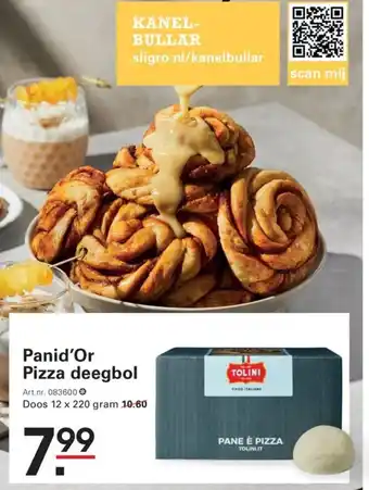 Met de Panid'Or Pizza deegbol (Art.nr. 083600) maak je eenvoudig heerlijke pizza's. De doos bevat 12 x 220 gram deegbollen, ideaal voor het maken van verschillende soorten pizza's. Of je nu kiest voor een klassieke Margherita of een pittige Pepperoni, met dit deeg maak je in een handomdraai de perfecte bodem. De Panid'Or Pizza deegbol is verkrijgbaar voor slechts 7.99 euro bij Sligro.nl. Scan de TOLINLIT code voor meer informatie of ga naar sligro.nl/kanelbullar voor andere heerlijke producten van Panid'Or, zoals de KANEL-BULLAR. Maak van jouw pizza-avond een succes met de Panid'Or Pizza deegbol!