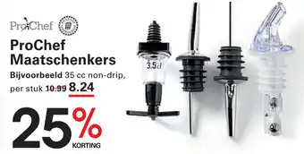 Met de ProChef Maatschenkers kunt u nauwkeurig vloeistoffen afmeten en schenken. Bijvoorbeeld de 35 cc non-drip maatschenker is ideaal voor het doseren van dranken in de horeca of thuis. Deze handige maatschenkers zijn nu verkrijgbaar met een korting van 25%. Normaal kosten ze 10.99 per stuk, maar nu slechts 8.24. Profiteer van deze aanbieding en maak het schenken van dranken een stuk eenvoudiger en preciezer. De maatschenkers zijn van hoge kwaliteit en kunnen herhaaldelijk worden gebruikt. Bestel ze vandaag nog en geniet van het gemak en de nauwkeurigheid die de ProChef Maatschenkers bieden.