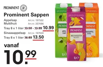 Geniet van de heerlijke smaak van Prominent Sappen met deze Tray van 8 x 1 liter. De Multifruit variant (Art.nr. 197502) bevat een mix van verschillende vruchten en is nu verkrijgbaar vanaf slechts 10.99. De Sinaasappelsap variant (Art.nr. 197500) is gemaakt van 100% sap uit concentraat en kost nu maar 13.50 per Tray. Beide sappen zijn U.S.I.E.F. en PROMINENT ® en zitten boordevol vitamines en smaak. Ideaal voor thuis, op kantoor of onderweg. Bestel nu en geniet van de verfrissende en natuurlijke smaak van Prominent Sappen. Verwen jezelf en je gasten met deze hoogwaardige sappen van topkwaliteit.