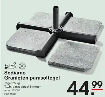 De Sediamo Granieten parasoltegel is momenteel met korting verkrijgbaar bij Sligro. Hier vind je alle details over prijs, geldigheidsduur en actievoorwaarden. Vergeet niet om ook andere aanbiedingen en deals voor Sediamo Granieten parasoltegel te bekijken zodat je zeker weet dat je de beste prijs betaalt. De kortingsactie loopt van 29-01-2026 tot 16-02-2026. Is de actie inmiddels verlopen? Geen zorgen, vergelijk dan soortgelijke aanbiedingen of volg de productcategorie voor toekomstige prijsverlagingen. Zo koop je altijd met voordeel.Veelgestelde vragen over Sediamo Granieten parasoltegel