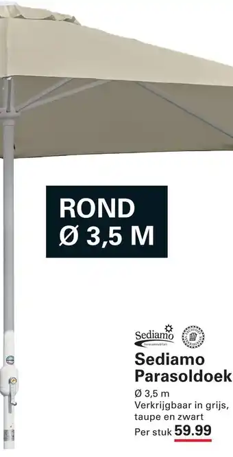 De prijs van de Sediamo Parasoldoek kan ook teruggevonden worden hierboven op de pagina, samen met de datum van wanneer de aanbieding beschikbaar is. Ook kun je de prijzen in de huidige Sligro folder of op de Sligro website controleren. De aanbiedingen verzekeren je van het kopen van de Sligro producten voor de laagste prijs.