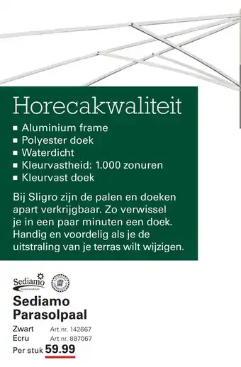 Sligro biedt naast de Sediamo Parasolpaal een ruime collectie producten aan. Houd de wekelijkse Sligro folder in de gaten om de beste aanbiedingen en acties te vinden. Naast Sediamo Parasolpaal, kunt u ook de volgende aanbiedingen vinden: Sediamo Parasolpaal, Sediamo Parasolpaal & Sediamo Parasolpaal.