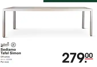 De Sediamo Tafel Simon is momenteel met korting verkrijgbaar bij Sligro. Hier vind je alle details over prijs, geldigheidsduur en actievoorwaarden. Vergeet niet om ook andere aanbiedingen en deals voor Sediamo Tafel Simon te bekijken zodat je zeker weet dat je de beste prijs betaalt. De kortingsactie loopt van 29-01-2026 tot 16-02-2026. Is de actie inmiddels verlopen? Geen zorgen, vergelijk dan soortgelijke aanbiedingen of volg de productcategorie voor toekomstige prijsverlagingen. Zo koop je altijd met voordeel.Veelgestelde vragen over Sediamo Tafel Simon