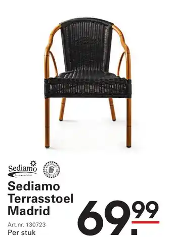 Deze Sediamo Terrasstoel Madrid is nu in de aanbieding bij Sligro. Bekijk ook andere lopende acties en bespaar met scherpe prijzen of online deals. Bestel Sediamo Terrasstoel Madrid via Sligro website of koop het product met korting in een winkel bij jou in de buurt. Op Folderz.nl verzamelen we dagelijks de beste Sediamo Terrasstoel Madrid aanbiedingen. Klik op het belletje om een gratis melding te ontvangen zodra er weer een nieuwe actie of prijsverlaging voor Sediamo Terrasstoel Madrid beschikbaar is.Veelgestelde vragen over Sediamo Terrasstoel Madrid