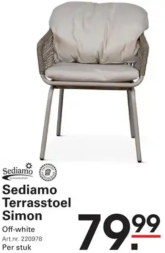 De Sediamo Terrasstoel Simon is momenteel met korting verkrijgbaar bij Sligro. Hier vind je alle details over prijs, geldigheidsduur en actievoorwaarden. Vergeet niet om ook andere aanbiedingen en deals voor Sediamo Terrasstoel Simon te bekijken zodat je zeker weet dat je de beste prijs betaalt. De kortingsactie loopt van 19-02-2026 tot 09-03-2026. Is de actie inmiddels verlopen? Geen zorgen, vergelijk dan soortgelijke aanbiedingen of volg de productcategorie voor toekomstige prijsverlagingen. Zo koop je altijd met voordeel.Veelgestelde vragen over Sediamo Terrasstoel Simon