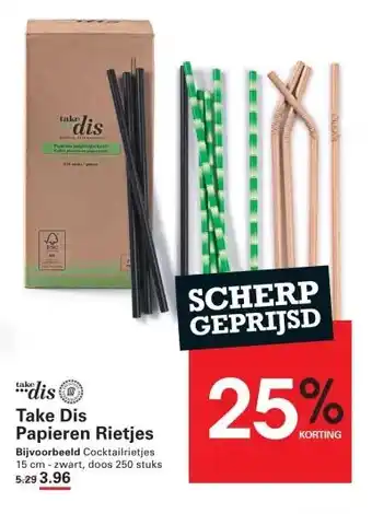 De aanbieding is verkrijgbaar in verschillende winkels, bekijk alle producten om de goedkoopste Take Dis Buigrietjes zwart papier 24cm te krijgen. Als je graag wilt kijken of het artikel met meer korting te koop is in een andere winkel, bekijk de categorie 'Groothandel'. Wellicht vind je deze aanbiedingen ook interessant: dis Take Dis Afvalzakken, Take Dis Draagplateau & Take Dis Shotglazen.