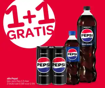 1+1 GRATIS: Alle Pepsi, bijv. zero fles 1.5 liter, 2 stuks van 5.98 voor 2.99