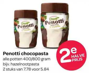 Geniet van de heerlijke smaak van Penotti chocopasta in alle potten van 400/800 gram, zoals hazelnootpasta. Nu verkrijgbaar in een Duo Penotti aanbieding: 2 stuks van 7.78 voor slechts 5.84. Profiteer van deze geweldige deal en bespaar op jouw favoriete chocopasta. Of je nu de voorkeur geeft aan hazelnootpasta of een andere variant, er is voor ieder wat wils. Smeer het op je boterham, gebruik het als topping voor pannenkoeken of geniet er gewoon zo van. Met de halve prijs actie hoef je niet te kiezen tussen kwaliteit en prijs. Haal snel jouw voorraad Penotti chocopasta in huis en geniet van deze smeuïge lekkernij.