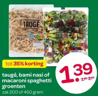 De prijs van de Taugé, bami nasi of macaroni spaghetti groenten kan ook teruggevonden worden hierboven op de pagina, samen met de datum van wanneer de aanbieding beschikbaar is. Ook kun je de prijzen in de huidige Spar folder of op de Spar website controleren. De aanbiedingen verzekeren je van het kopen van de Spar producten voor de laagste prijs.