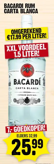 BACARDI RUM CARTA BLANCA, ook bekend als BACARDÍ CARTA BLANCA, is een superieure witte rum die ontwikkeld is door de Bacardi Company, opgericht in Cuba in 1862. Deze blended rum heeft een rijke smaak en is perfect om te mixen in cocktails of puur te drinken. Met een inhoud van 1.5 liter is deze fles XXL formaat ideaal voor feestjes en gezellige avonden met vrienden. Elders betaal je €32,99 voor deze fles, maar bij ons slechts €25,99, omgerekend €17,99 per liter! Profiteer van deze 7-goedkoper aanbieding en geniet van de authentieke smaak van Bacardi rum. Let op: als je jonger bent dan 25 jaar, vergeet niet je legitimatie te tonen!