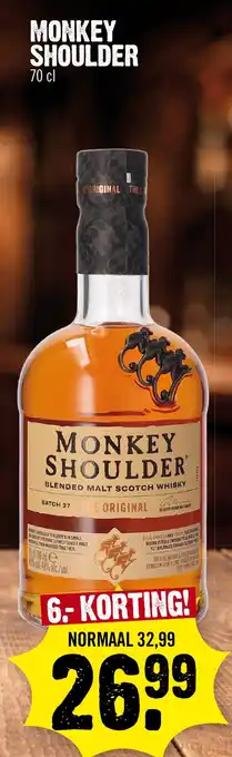 Monkey Shoulder is een blended malt Scotch whisky, geselecteerd door onze Malt Master en samengesteld uit de beste single malt whisky's uit Speyside. Deze rijke, gladde en fruitige blend is gedurfd genoeg om te mixen, maar toch gebalanceerd genoeg om puur van te genieten. Gedistilleerd en gerijpt door William Grant & Sons Ltd. Normaal €32,99, nu slechts €26,99. Batch 27 van The Original Monkey Shoulder is samengesteld in kleine batches en vervolgens gemengd. Profiteer van €6,- korting op deze heerlijke whisky. Geniet van de unieke smaak en kwaliteit van Monkey Shoulder, een whisky die perfect is voor elke gelegenheid.