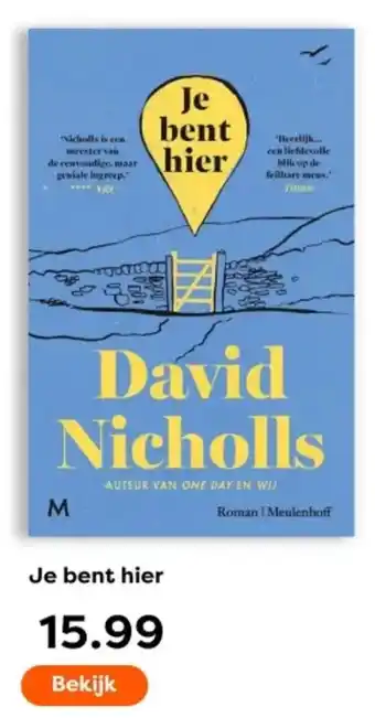 In 'Je Bent Hier' neemt David Nicholls, auteur van 'One Day' en 'Wij', je mee op een heerlijke en liefdevolle reis door het leven van de hoofdpersonages. Met een prijs van slechts 15.99 euro is dit boek zeker het bekijken waard. Nicholls staat bekend om zijn meesterlijke schrijfstijl en weet met simpele, maar geniale ingrepen de lezer te raken en te ontroeren. 'Je Bent Hier' is een roman die je niet onberoerd zal laten en die je meesleept tot de laatste bladzijde. Laat je verrassen door de prachtige verhaallijnen en de diepgaande karakters in dit boek van Meulenhoff. Bestel nu en geniet van een literair meesterwerk!