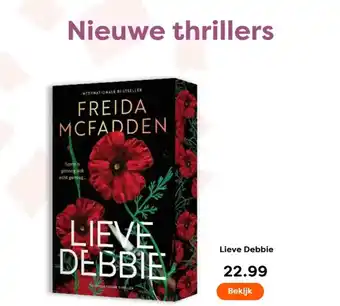 Lieve Debbie is een nieuwe psychologische thriller van internationale bestsellerauteur Freida McFadden. Soms is genoeg ook echt genoeg, en dat geldt zeker voor Debbie. Wanneer haar leven op zijn kop wordt gezet door een reeks verontrustende gebeurtenissen, begint ze te twijfelen aan alles en iedereen om haar heen. Met een prijskaartje van slechts 22.99 is dit boek een absolute must-read voor liefhebbers van spannende verhalen. Laat je meeslepen in de duistere wereld van Lieve Debbie en ontdek hoe ver ze zal gaan om de waarheid te achterhalen. Bekijk nu deze weergaloze psychologische thriller en bereid je voor op een zenuwslopend avontuur!