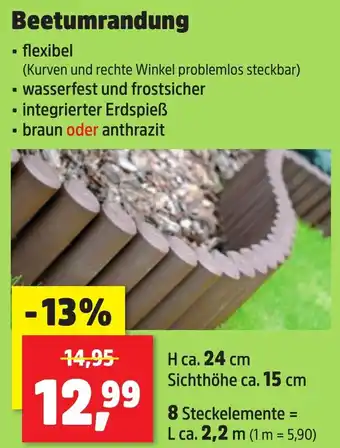 Deze flexibele Beetomranding is ideaal voor het afbakenen van tuinpaden en bloemperken. Dankzij het slimme ontwerp zijn zowel bochten als rechte hoeken probleemloos te maken. De rand is waterbestendig en bestand tegen vorst, waardoor hij het hele jaar door buiten kan blijven staan. Met een geïntegreerde grondpen is de rand eenvoudig te bevestigen. Je hebt de keuze uit de kleuren bruin of antraciet, en profiteert momenteel van een korting van 13%. De set bestaat uit 8 steekelementen, met een hoogte van ongeveer 24 cm en een zichtbare hoogte van 15 cm. Deze praktische en duurzame Beetomranding is nu verkrijgbaar voor slechts €12,99.