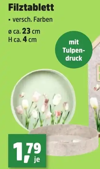 Dit Filztablett is een handig en stijlvol accessoire voor in huis. Het heeft een diameter van ongeveer 23 cm en een hoogte van 4 cm. Het Filztablett is verkrijgbaar in verschillende kleuren, waardoor er altijd wel een variant is die bij jouw interieur past. Het unieke Tulpenprint design geeft een vrolijke en frisse uitstraling aan het Filztablett. Gebruik het Filztablett bijvoorbeeld als onderzetter voor hete pannen of als decoratief element op tafel. Dankzij de stevige en duurzame materialen gaat het Filztablett lang mee. Haal dit praktische en mooie Filztablett in huis voor slechts €1,79 en geniet van de vele mogelijkheden die het te bieden heeft.