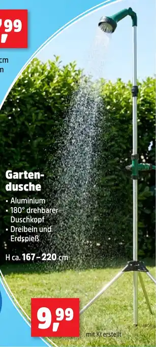Geniet van verfrissing in je tuin met deze handige Gartendouche. De aluminium Gartendouche is voorzien van een 180° draaibare douchekop en een driepoot en grondpin voor stabiliteit. De Gartendouche is eenvoudig te monteren en kan overal in de tuin geplaatst worden. De hoogte van de Gartendouche is verstelbaar en de douchekop kan 180 graden gedraaid worden voor optimaal gebruiksgemak. De Gartendouche is gemaakt van hoogwaardig aluminium en heeft een moderne uitstraling. Voor slechts 7,99 is deze praktische tuindouche van jou. Verfris jezelf op warme zomerdagen en geniet van het gemak van een eigen Gartendouche in de tuin.