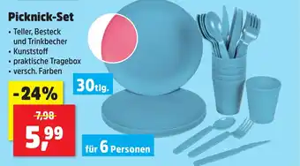 Deze handige picknickset bevat alles wat je nodig hebt voor een gezellige maaltijd in de buitenlucht. De set bestaat uit borden, bestek, drinkbekers en is gemaakt van stevig kunststof. Alles past netjes in de praktische draagbox, die verkrijgbaar is in verschillende kleuren. Met deze set ben je helemaal klaar voor een picknick met 6 personen. En het beste van alles is dat deze set nu met 24% korting verkrijgbaar is voor slechts 5,99. Wacht niet langer en haal deze handige picknickset in huis voor de zomerse dagen die komen gaan. Geniet van heerlijke maaltijden in de buitenlucht met deze complete set!